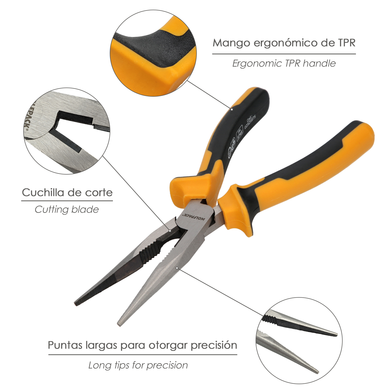 – Mango ergonómico realizado en TPR, con base de plástico y agarre engomado.