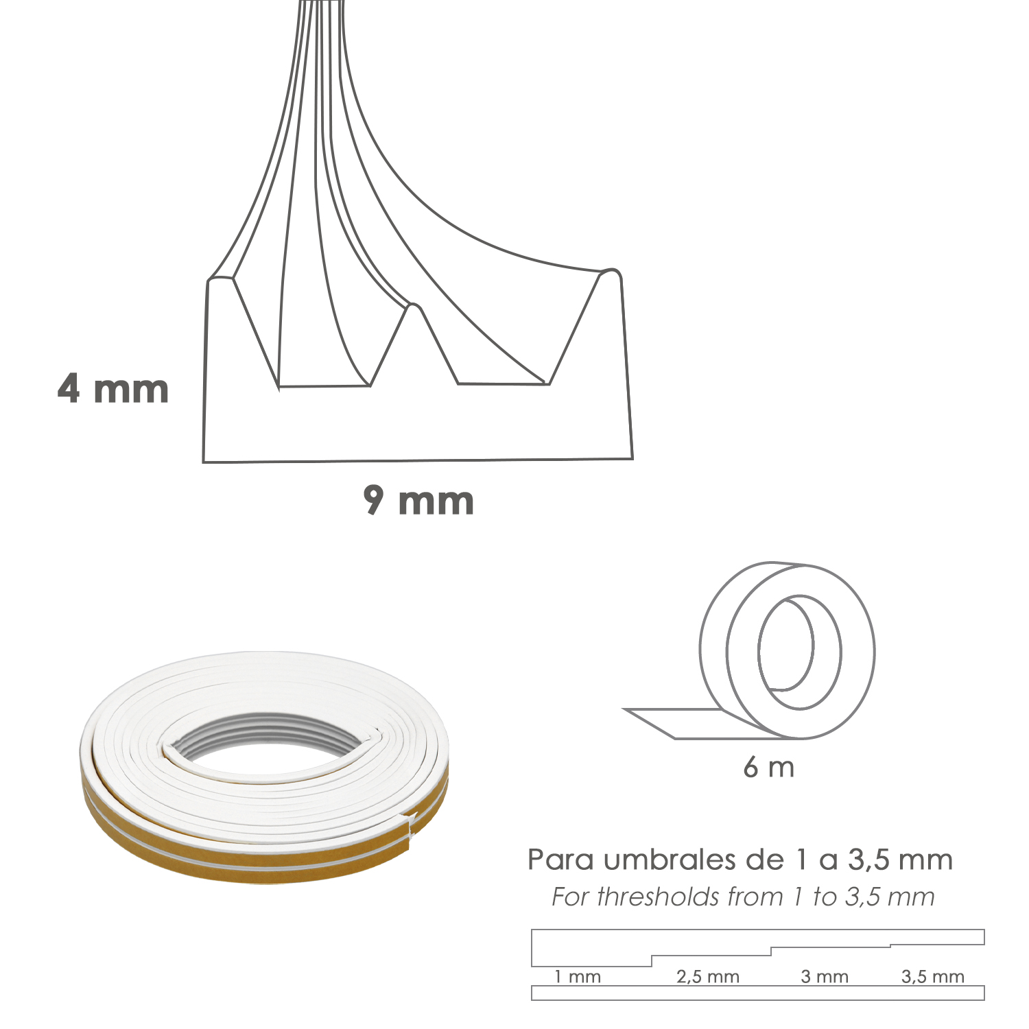 Burlete Caucho Blanco Rollo 6 Metros x 9 mm. Sellador Ventanas y Puertas. Aisla Del Ruido. Para Umbrales de 1 A 3,5 mm.