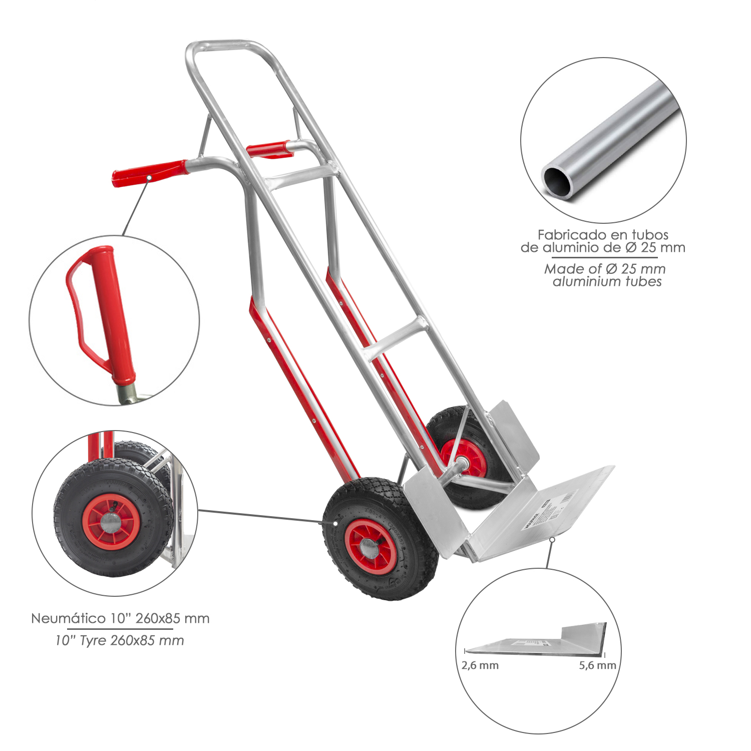 Carretilla almacén aluminio rueda neumática.