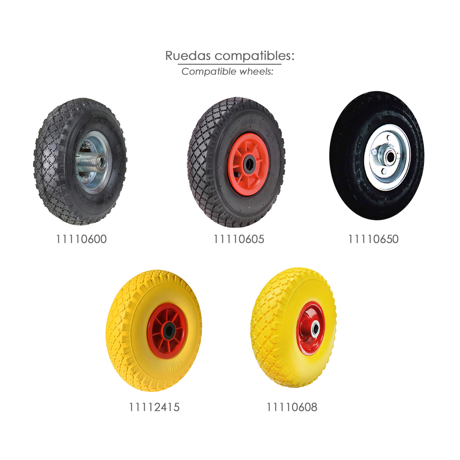 – Contiene dos ruedas neumáticas de Ø 260 x 85 mm. (10″) con válvula Schrader.