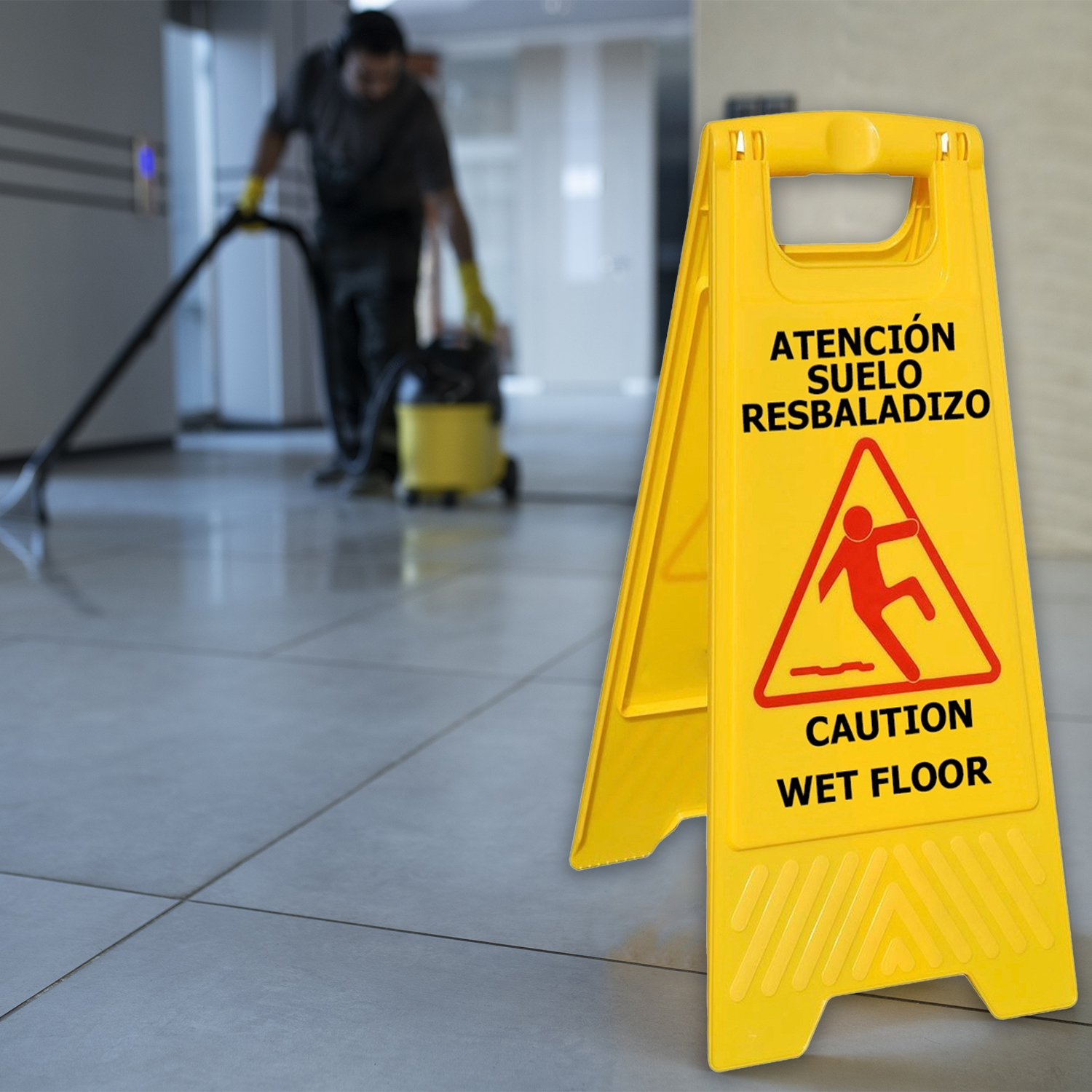 Cartel atencion suelo resbaladizo.