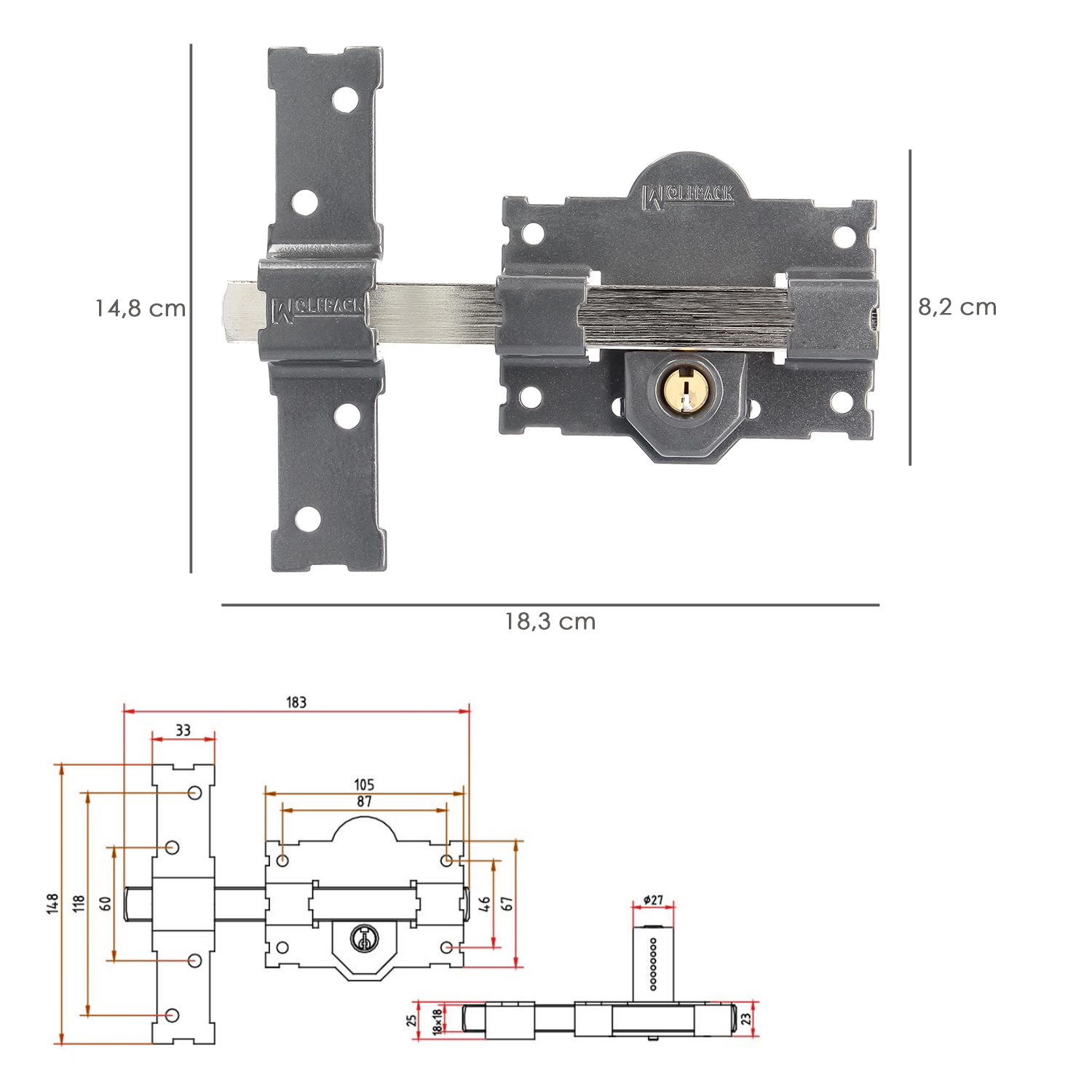 Cerrojo b-2 llave 2 lados pasador de 183mm cilindro redondo de 50mm