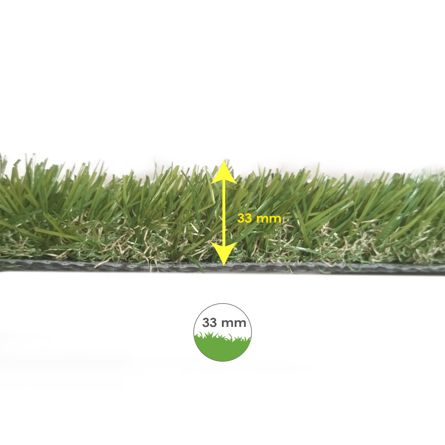 – Césped artificial de alta densidad con una altura de 33 mm.