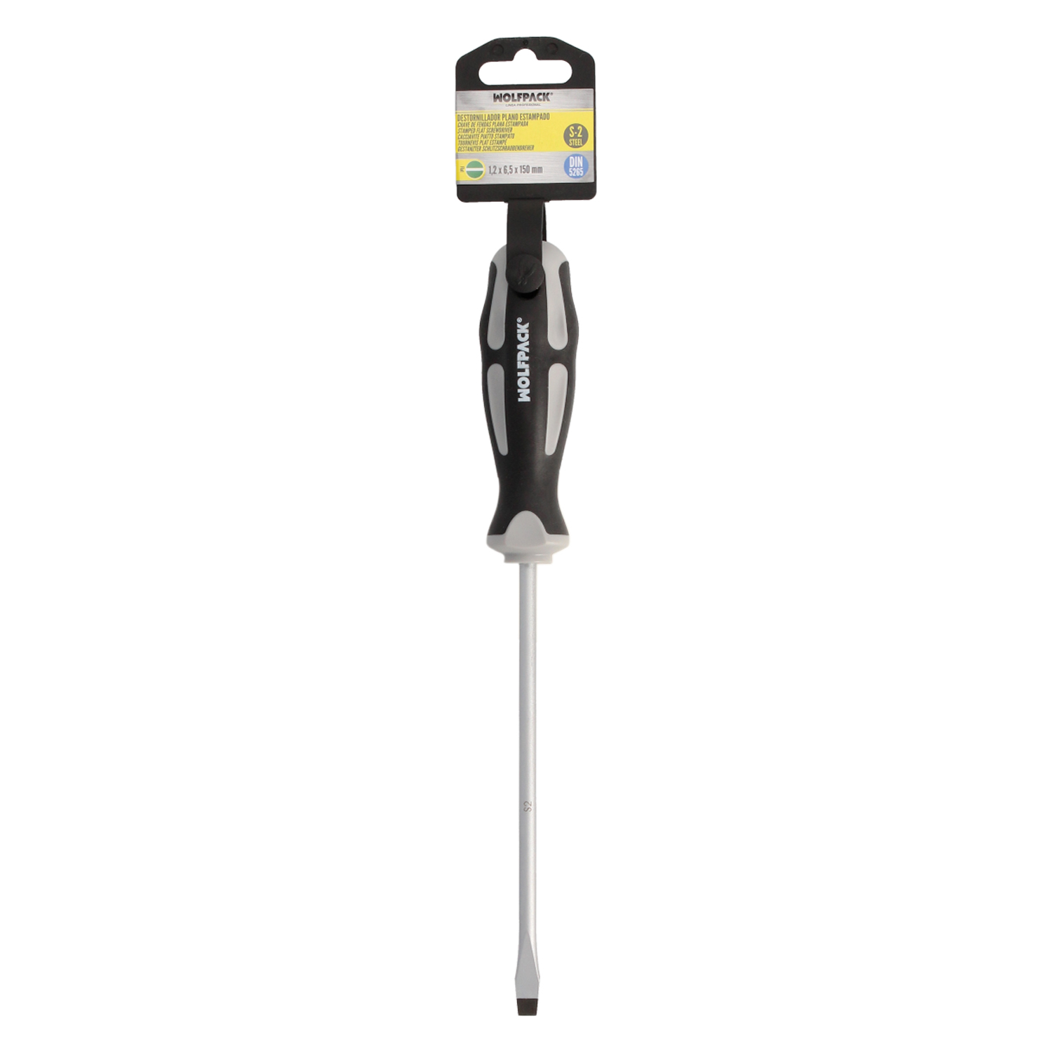 Destornillador Plano Estampado Acero S2 Mango TPR Bimaterial. Medida 1,2 x Ø 6,5 x 150 mm. DIN5265