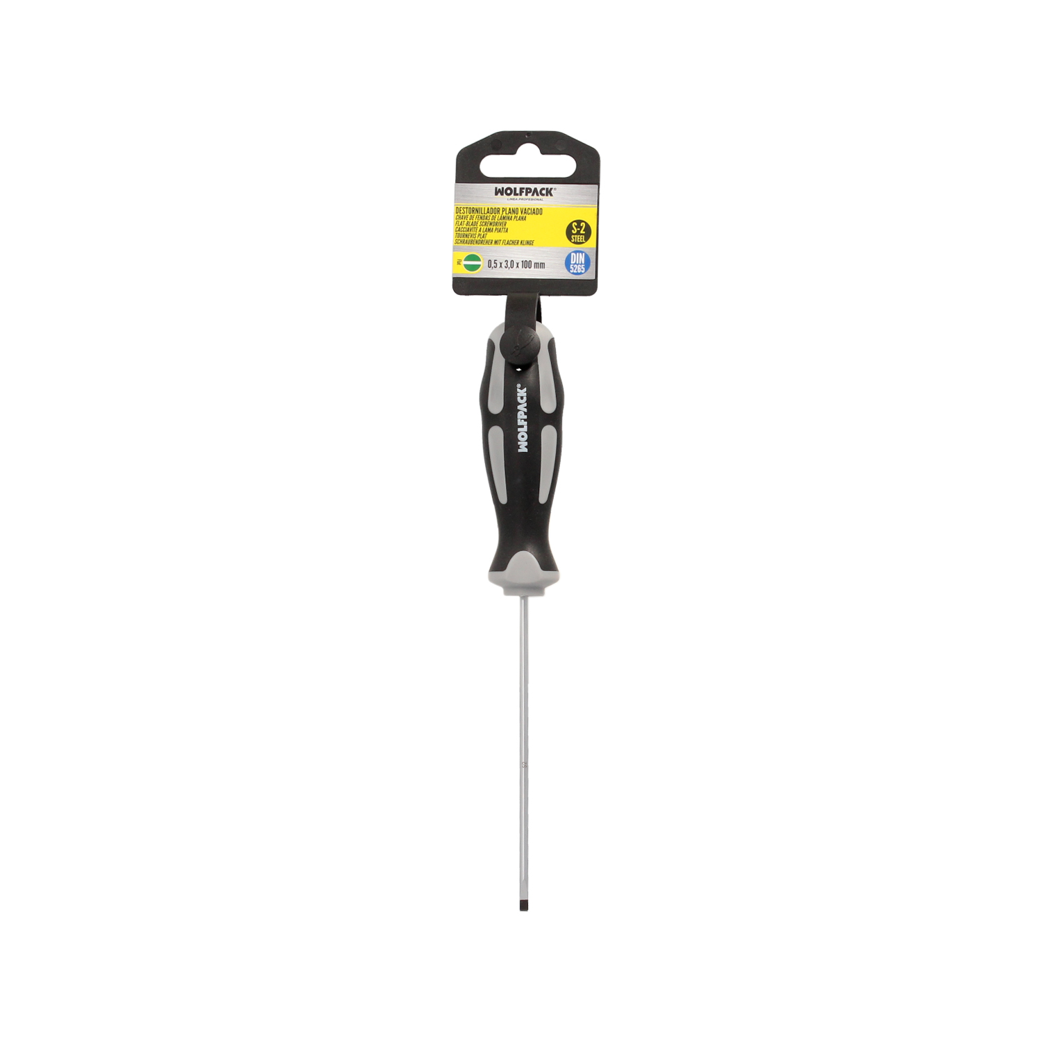 Destornillador Plano Vaciado Acero S2 Mango TPR Bimaterial. Medida 0,5 x Ø 3,0 x 100 mm. DIN5265
