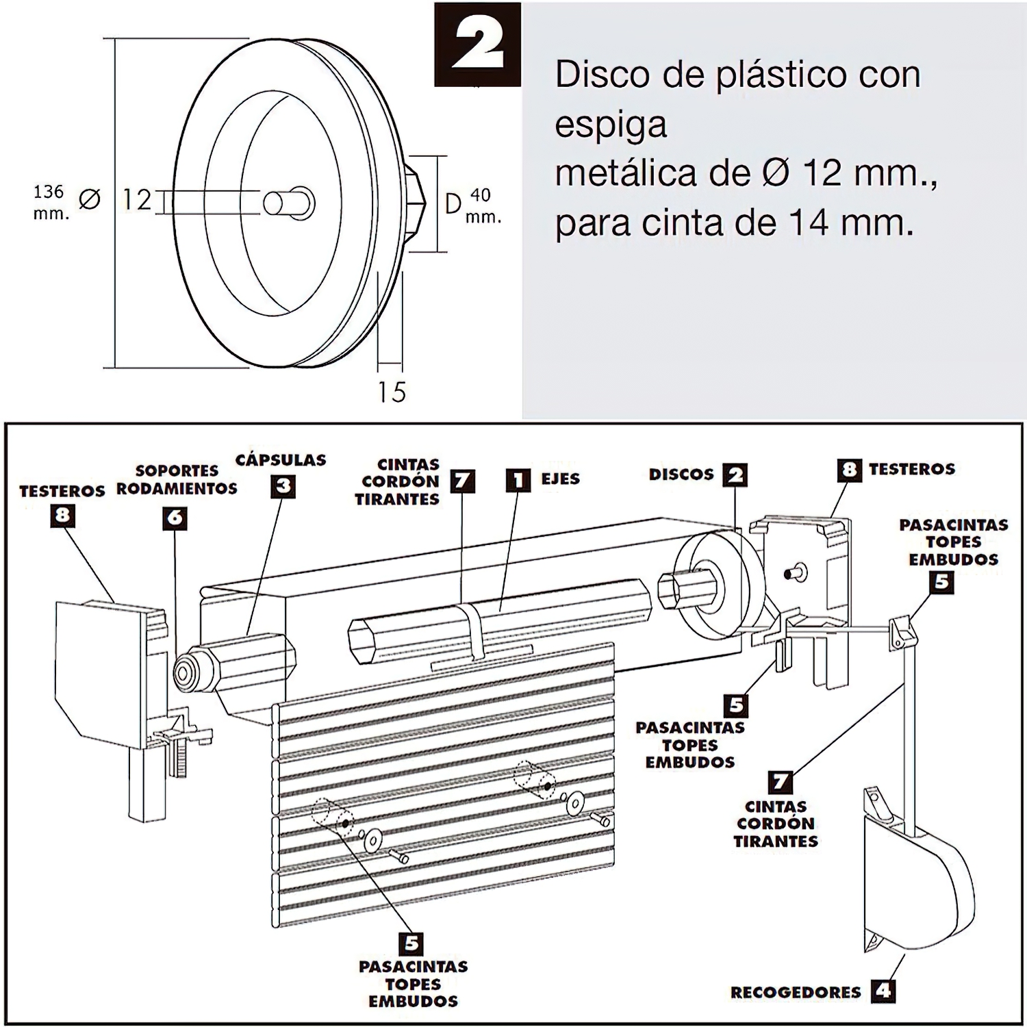 Disco Persiana Plastico Espiga Metalica 136×40 mm. Cinta 14 mm.