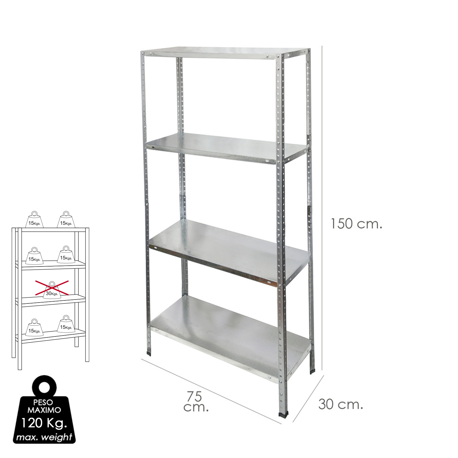 Estanteria Acero Galvanizado con 4 Baldas 150x75x30 cm. Baldas ajustables. Peso maximo 120 Kg.