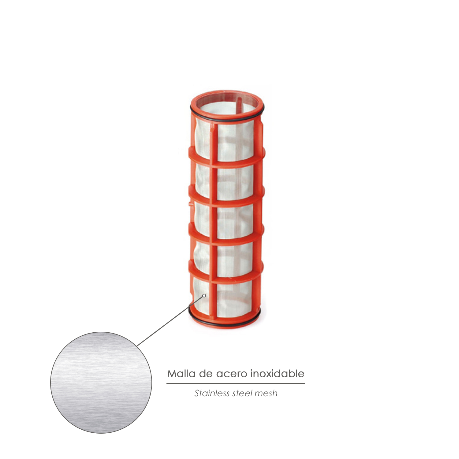 – El cartucho de malla tiene una capacidad de filtración de 100 mesh, incorpora 2 juntas toricas en los extemos para una mayor estanqueidad y reducción de suciedad.