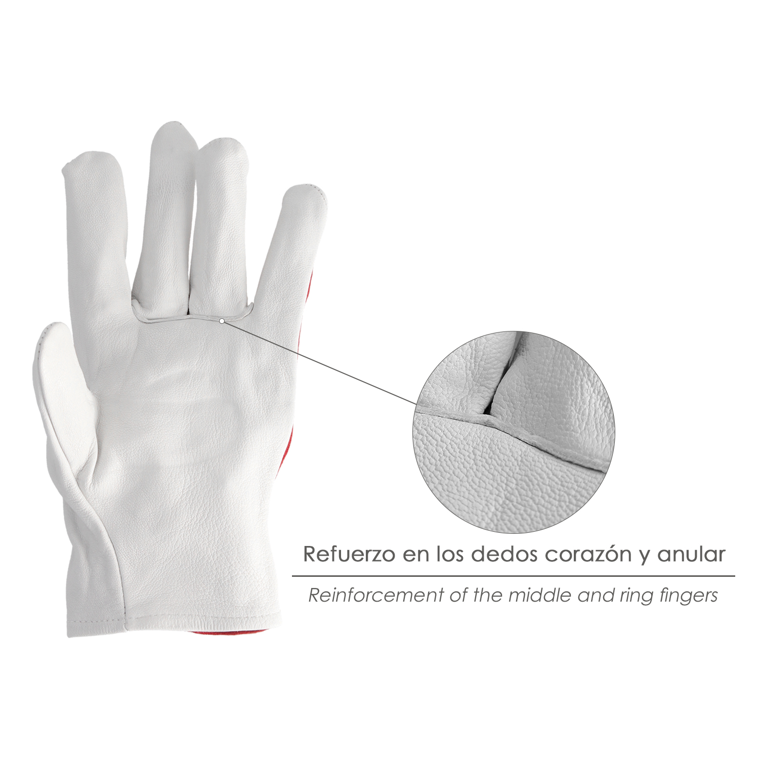 – Costura de refuerzo en el dedo corazón y anular.