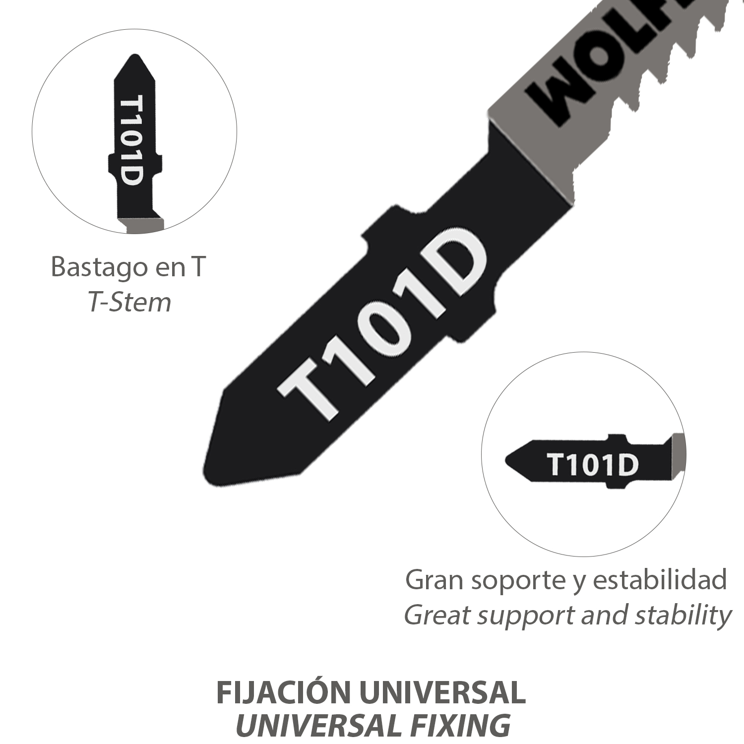 – Vastago en forma de T, compatible con la mayoría de modelos de sierra de calar.