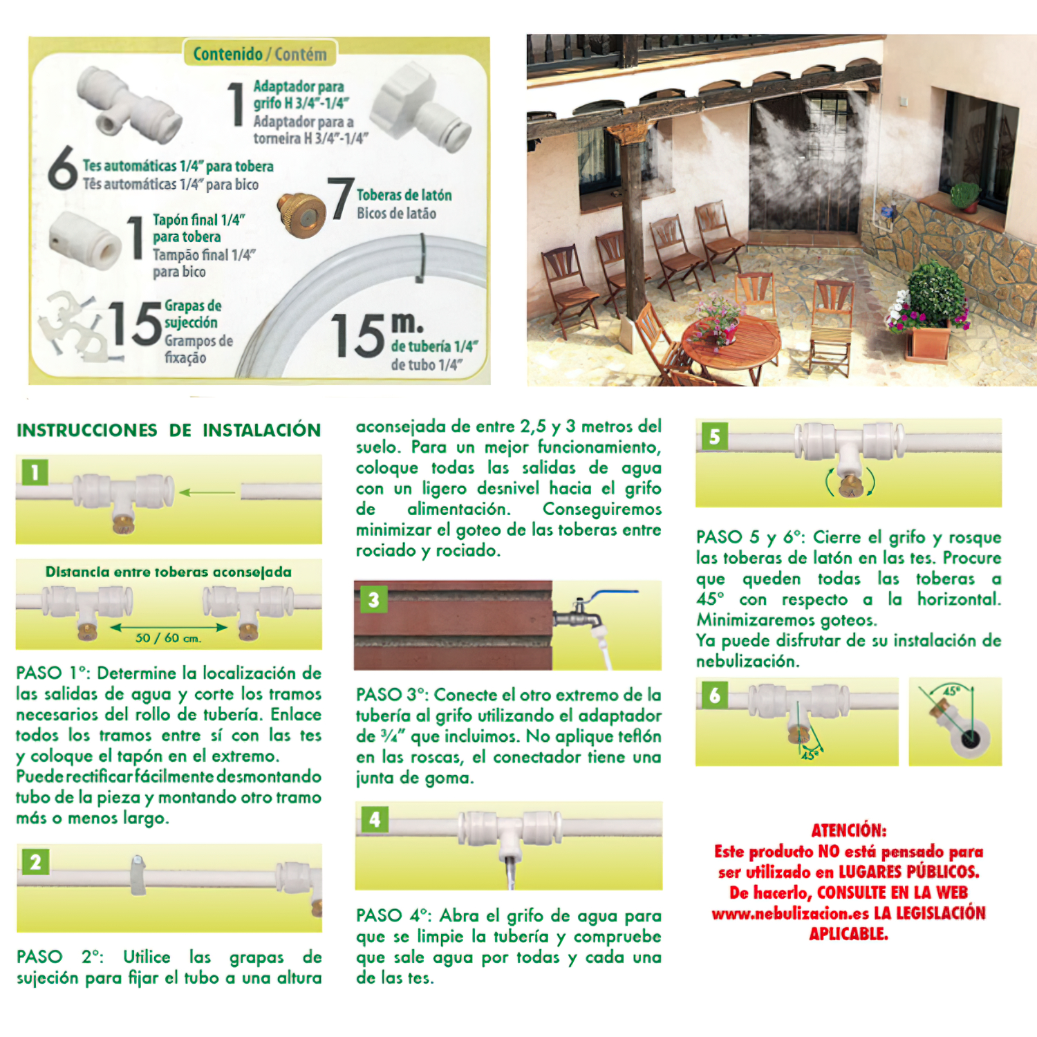 – Si las toberas de nebulización se obstruyeran, sumérjalas en una solución de ácido clorhídrico (lo que comercialmente se conoce como agua fuerte es ácido clorhídrico generalmente al 24%), al 12%, durante 30 minutos. Después enjuáguelas con abundante agua limpia. Contenido: 1 adaptador para grifo 3/4-1/4, 6 tes automáticas 1/4 para tobera, 7 toberas de latón, 1 tapón final 1/4 para tobera, 15 grapas de sujección, 15 metros de tuberia de 1/4.