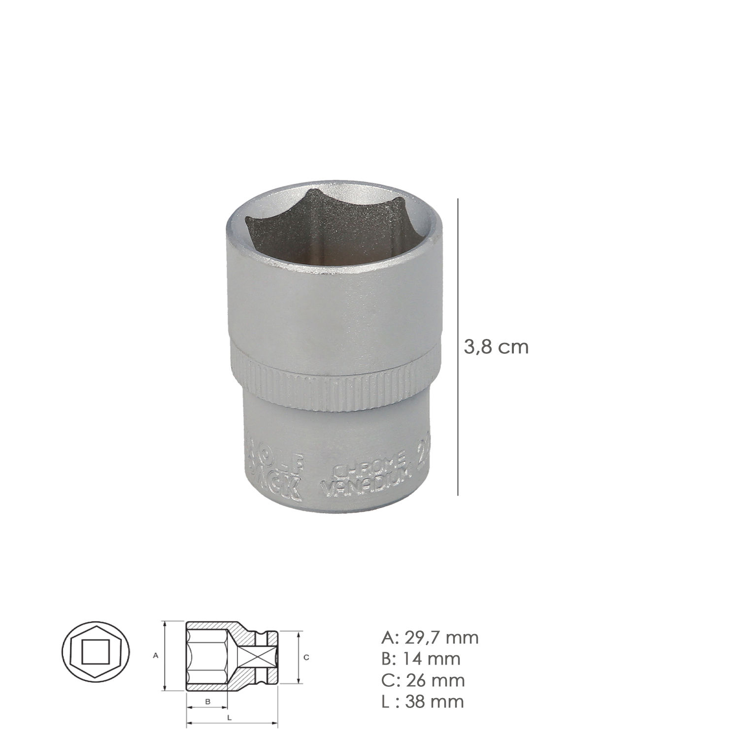 Llave Vaso 1/2″ Hexagonal 22 mm. Perfil de 6 caras. Acero Cromo Vanadio, Aristas Redondas