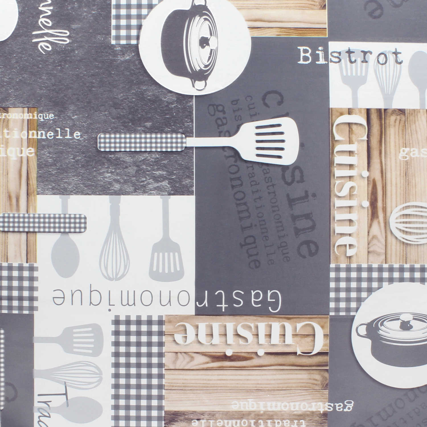 – Mantel Hule estampado en tonos grises y madera con formas de utensilios de cocina. Diseño moderno y elegante para cualquier ocasión.