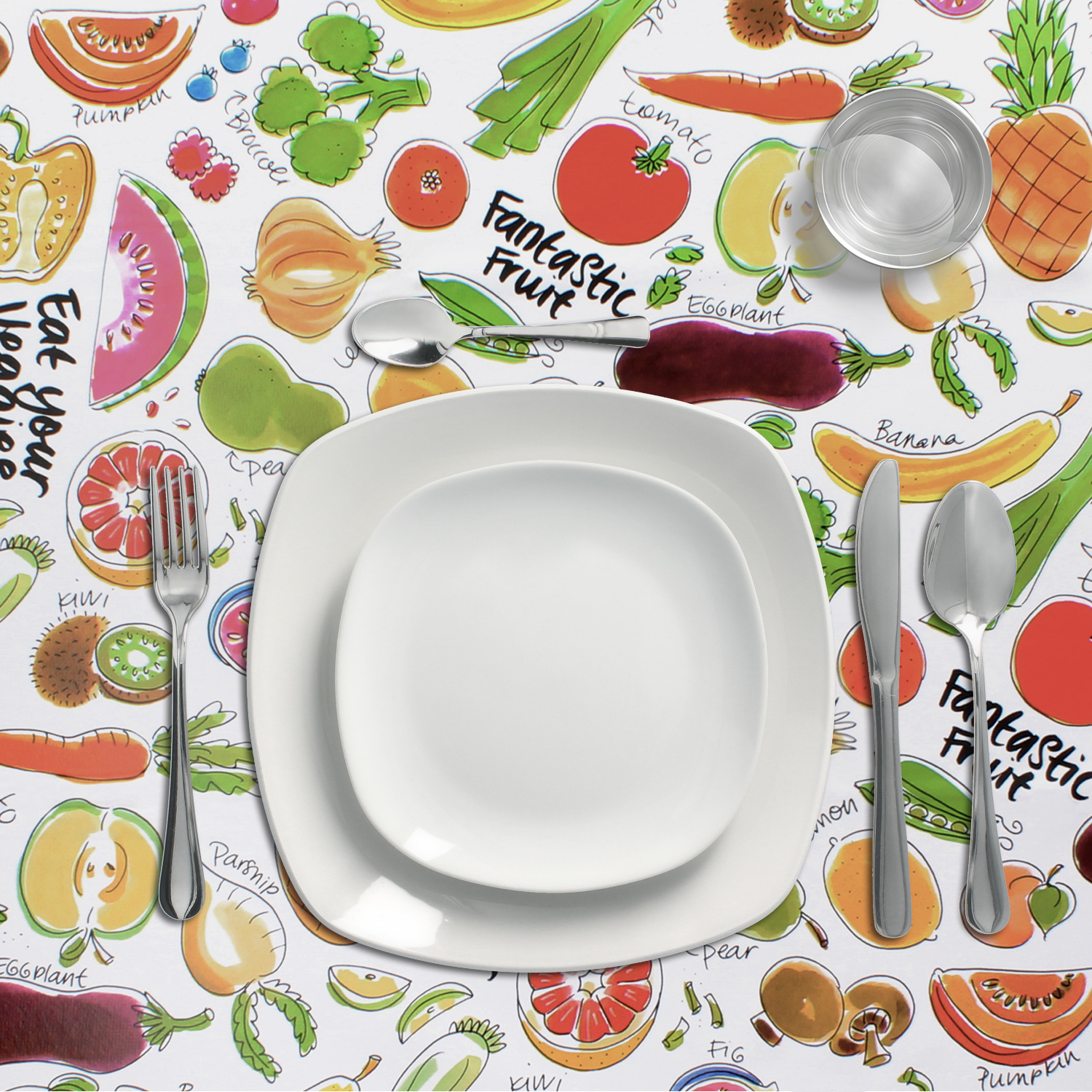 – Mantel Hule estampado en color blanco con estampado de fruta fantasia. Diseño moderno y elegante para cualquier ocasión.