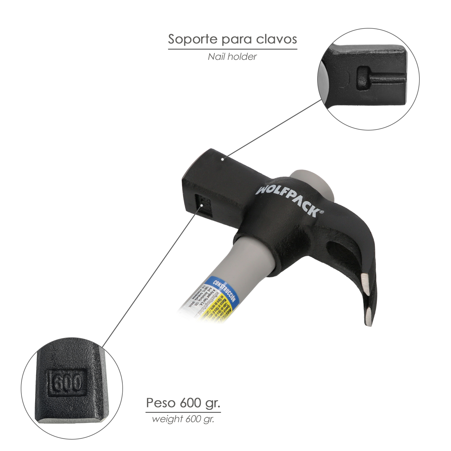 Martillo Uña Mango Fibra Vidrio Mango Fibra Vidrio Con Empuñadura Antideslizante. 600 Gramos 33 cm.