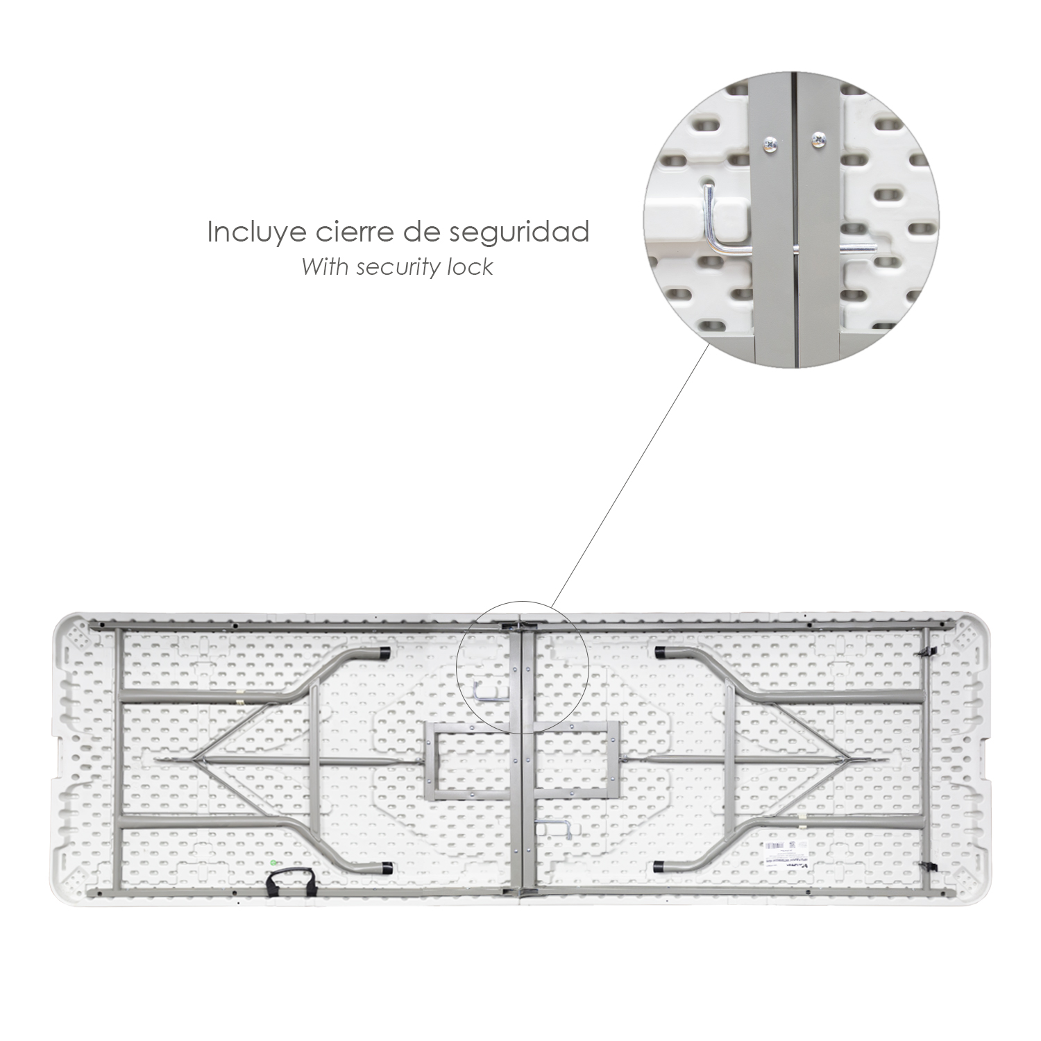 – Cuenta con cierre de seguridad para ajustar su total apertura y evitar que la mesa se cierre. Las patas también cuentan con sistema de seguridad, para que estas no se cierren de forma involuntaria.
