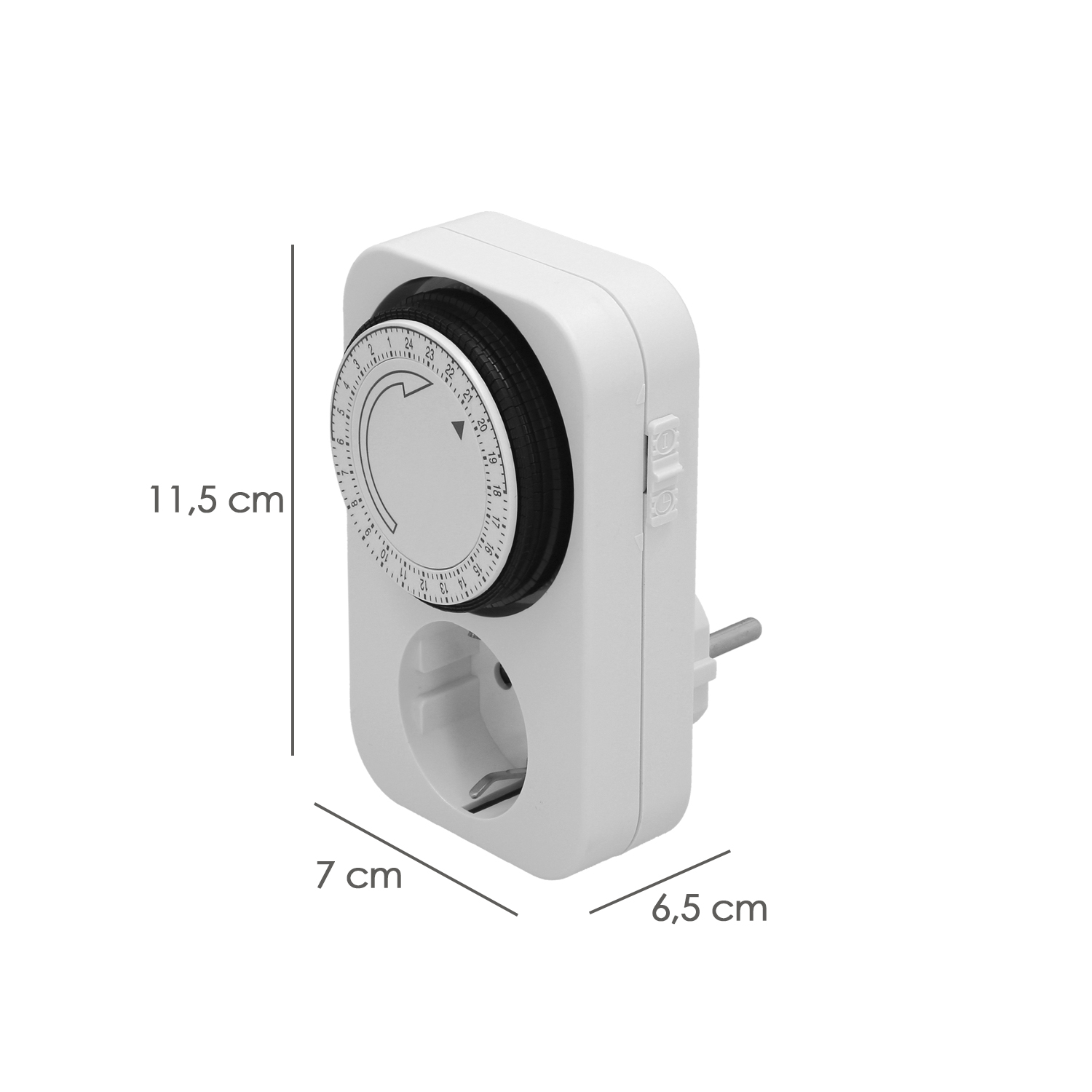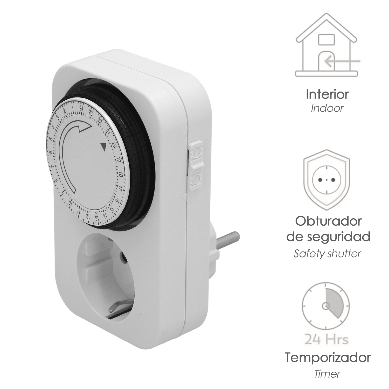 – Artículo también conocido como temporizador mecánico, temporizador 24 horas, control horario eléctrico, temporizador, programador mecánico, interruptor automático, enchufe programable, enchufe temporizador, etc.