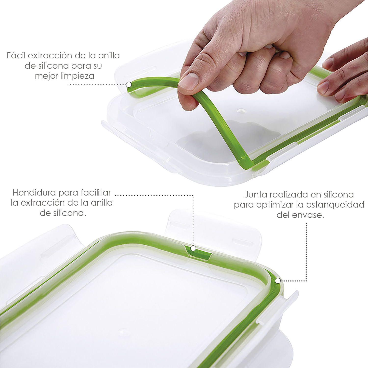 – Recipientes herméticos para una mejor conservación y un transporte sin derrames, no conserva olor ni sabor de alimentos contenidos anteriormente. Las tapas cuentan con un sistema de 4 cierres de bloqueo además están realizadas en silicona inyectada que se adhiere al cristal aislando los alimentos de gérmenes y olores externos y favoreciendo su perfecta conservación.