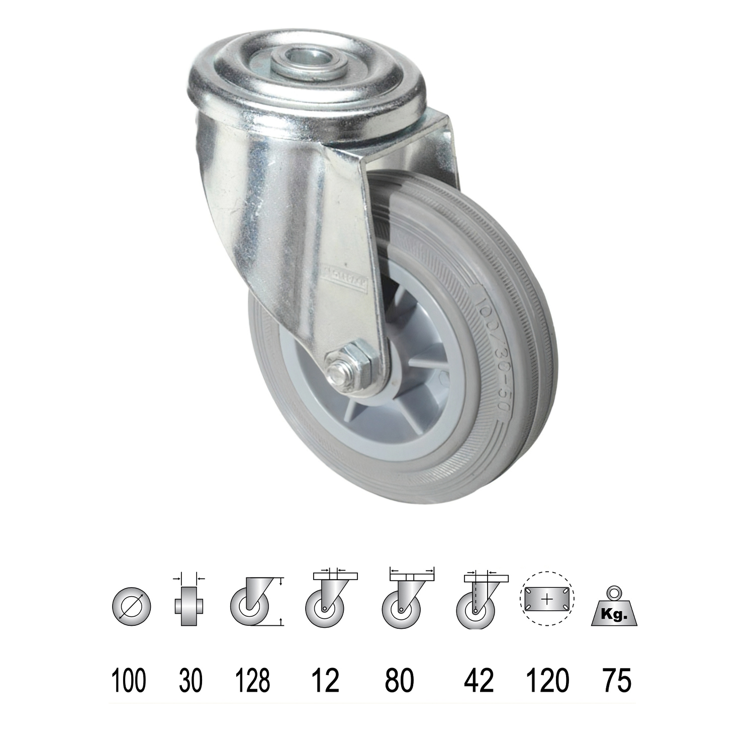 Rueda Industrial Goma Gris Pasante 100 mm.
